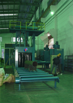 我公司設(shè)計(jì)制造的通過式拋丸機(jī)已調(diào)試完成,通過驗(yàn)收投入使用;它能夠?qū)μ幱谠紶顟B(tài)的鋼材表面施以強(qiáng)烈拋丸,清除其銹斑和焊渣及氧化層;
