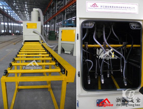 左圖為噴砂處理工件入口輸送滾軸平臺(tái),右圖為設(shè)備內(nèi)部工作艙結(jié)構(gòu)